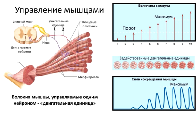 Следует сказать, что свойства быстрых и медленных двигательных единиц не являются строго полярными и существует широкий спектр переходных типов мотонейронов и соответственно двигательных единиц, обладающих в равной мере и теми и другими свойствами. Таким образом, при низком уровне супраспинальной синаптической активности, необходимым для осуществления слабого движения, первыми будут включаться в активность малые мотонейроны, двигательные единицы которых развивают относительно небольшую силу в сокращении. При нарастании интенсивности супраспинальной активности соотвественно будут включаться более высокопороговые мотонейроны двигательных единиц, которые развивают большую силу. Это наряду с увеличением общего количества двигательных единиц, вовлеченных в активность, приведет к большей силе общего движения осуществляемого мышцей.