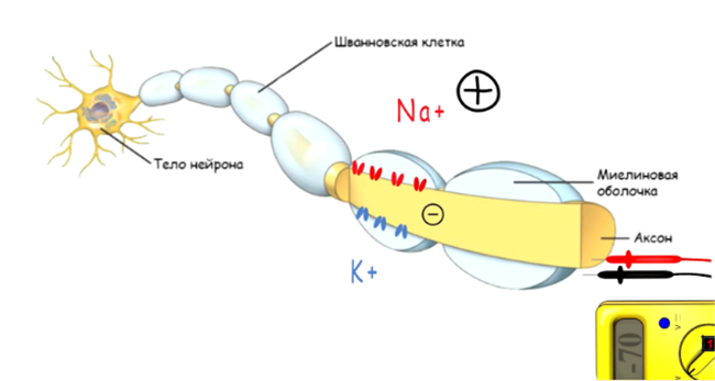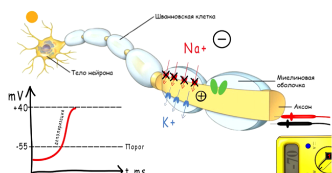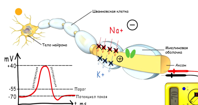 Основными факторами поддержания потенциалов покоя является выделение ионов натрия из клетки и поступления ионов калия в клетку, когда к нервному окончанию приходит потенциал действия в синаптическую щель выделяется ацетилхолин, который взаимодействует с рецепторами концевой пластинки мышечного волокна, в результате цепи биохимическим реакций повышается проницаемость синаптической мембраны для ионов натрия. Они диффундируют внутрь мышечного волокна вызывают деполяризацию, а проницаемость мембраны для ионов натрия и калия резко возрастает. В результате перераспределения их концентрации внутри и снаружи мышечного волокна, нарастающая деполяризация приводит к инверсии потенциала, а затем за счет избыточного выхода ионов калия из клетки происходит реполяризация мембраны с возвращением ее потенциала к исходному уровню.
