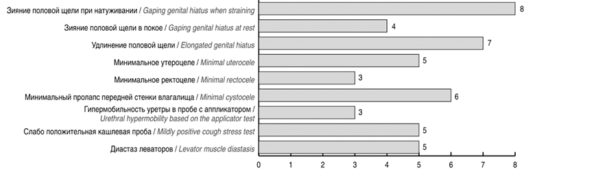 Обращает внимание, что пациентки не предъявляли жалобы активно, считая свое состояние естественным после родов, но при углубленном опросе жалобы были выявлены у 85,3% (нетяжелые запоры или эпизоды недержания газов, впервые появившиеся после родов, легкая постоянная или возникающая эпизодически мочевая инконтиненция, упорные бели при отсутствии кольпита или вагиноза, дискомфорт в области наружных половых органов при половом акте, жалобы мужа на недостаточное смыкание стенок влагалища при половом акте, недостаточная удовлетворенность половой жизнью, попадание воздуха во влагалище при движениях). Особенности родового акта и данные объективного осмотра пациенток при включении в исследование представлены на рис. 1, 2. Из диаграммы видно, что только у 23,5% пациенток группы очевидных факторов риска повреждения тазового дна не было. У прочих такие факторы имелись.